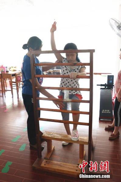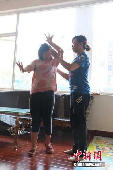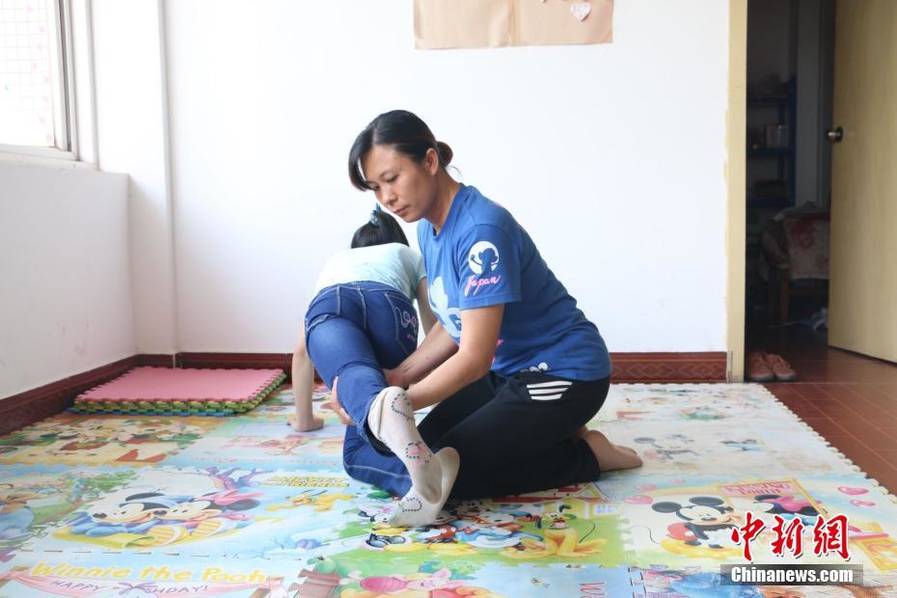 陈敬玉在给女儿做康复训练。