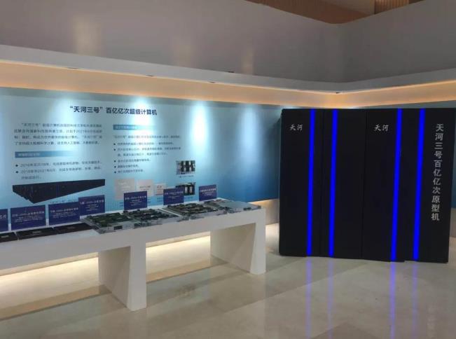 “天河三号”百亿亿次原型机。它由国家超级计算天津中心同国防科技大学联合研制,“天河三号”超级计算机的核心技术全面自主化,原型机系统采用三种国产自主高性能计算和通信芯片。(央视记者王哈男拍摄)