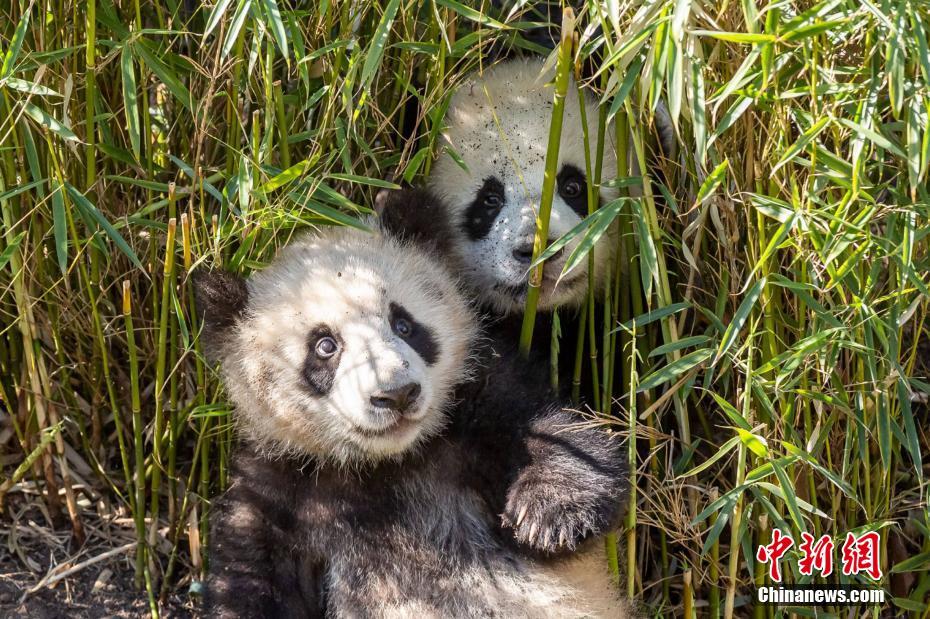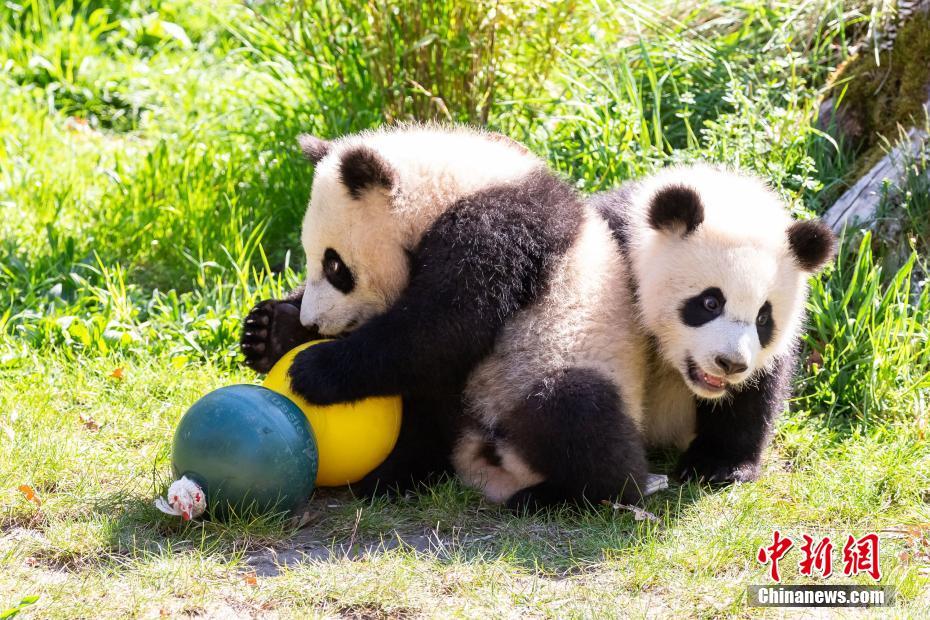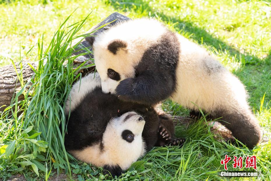 5月13日,德国柏林动物园发言人向中新社记者表示,柏林动物园在供应竹子方面未受新冠疫情影响,目前旅德大熊猫一家四口健康状况均十分良好。园方表示,除周末和节假日等入园游客较多的时段外,人们已可在大熊猫馆见到双胞胎“梦想”“梦圆”的身影。这对双胞胎的体重均已达到19公斤左右。图为大熊猫双胞胎“梦想”(前)和“梦圆”(后)(5月10日资料图)。中新社发 柏林动物园 供图